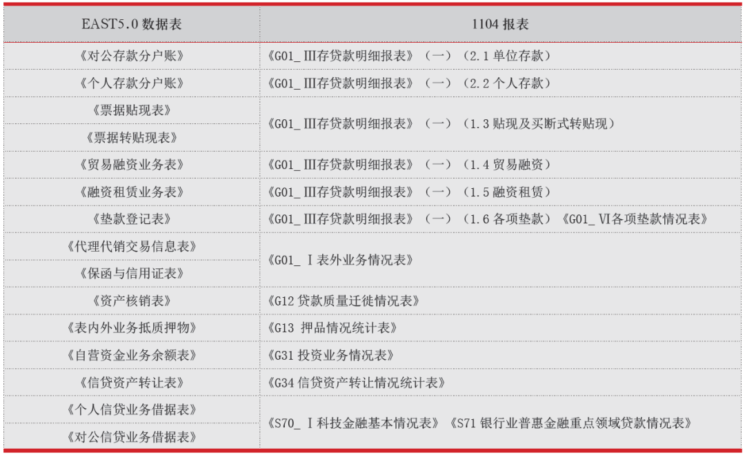 四是明确对应关系,强化交叉校验。进一步明确EAST数据与1104报表(即银保监会非现场监管报表,是银保监会面向银行业金融机构采集的描述被监管机构财务状况、风险情况及经营情况的一系列统计报表)、客户风险统计数据的对应关系,使相关数据表的字段设计更加贴近1104报表的数据加工逻辑,逐步统一各类监管数据的报送口径。