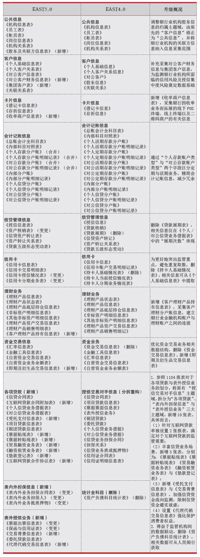 在主题域变动方面,EAST5.0在删除“授信交易对手信息”“统计全科目”两大主题域的基础上,对相关数据字段进行梳理整合、丰富扩充,调整形成“各项贷款”“表内外担保信息”“表外授信业务”三大新主题域。在数据表结构变动方面,EAST5.0在拓宽监管领域的同时,为避免规范体量因冗余信息变得臃肿、低效,删去了《贷款展期表》《持卡人基础情况表》《资金交易信息表》《资产负债科目统计表》等信息密度较低、存在其他信息获取渠道的数据表,并对部分数据表的采集字段进行优化组合,最终梳理形成《股东及关联方信息表》《对公客户财务信息表》《集团客户表》等28张新数据表。