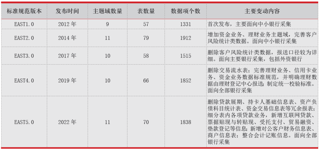为推动监管科技发展,充分发挥监管标准化数据在防范金融风险、促进银行业金融机构数字化转型与合规发展等方面的作用,进一步激发监管科技活力,银保监会于2022年1月正式发布EAST5.0。至此,监管数据标准化规范顺应银行业务演变与监管重点迁移,已历经四版更新(见表1),从开始仅面向中小银行试点,逐步推广至全部银行业机构,报送口径不断细化,校验标准不断明确,成为银保监会监管科技能力建设和监管大数据应用开发的重要抓手。